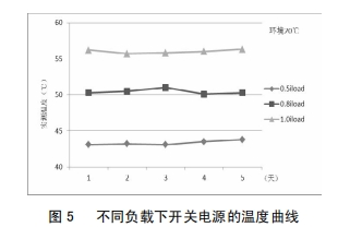 改良后,為考證改良效果,對(duì)開(kāi)關(guān)電源分別在0.5倍、0.8倍及1.0倍負(fù)載下停止了為期5天的帶負(fù)荷實(shí)驗(yàn),圖5為不同負(fù)載下開(kāi)關(guān)電源的溫度曲線(xiàn),由圖5可知,隨著負(fù)荷的增大,開(kāi)關(guān)電源問(wèn)題總體呈上升趨向;負(fù)載不變的狀況下,同一溫度曲線(xiàn)根本堅(jiān)持平滑;開(kāi)關(guān)電源在額定負(fù)載下運(yùn)轉(zhuǎn),最高溫度不超越57℃,未達(dá)報(bào)警值,開(kāi)關(guān)電源牢靠性得到顯著進(jìn)步。