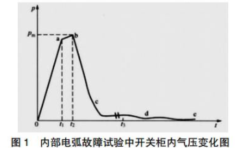 壓縮階段。0~t1時間內,柜體內部產生電弧到泄壓裝置通道口排出。設在t=0時柜體內部出現強大功率電弧,故障室內的壓力上升很快。內部故障電流越大,電弧電壓越高,隔內體積越小,則壓力上升越快。直到排氣口打開,這一階段才結束,持續的時間大約為5~10ms