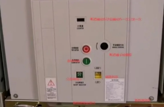 1,斷路器在分閘已儲(chǔ)能情況,儲(chǔ)能指示閃現(xiàn)已儲(chǔ)能,儲(chǔ)能彈簧已擺開(kāi),面板得合閘按鈕在上圖中的下孔中,假設(shè)斷路器未儲(chǔ)能是合不了閘的