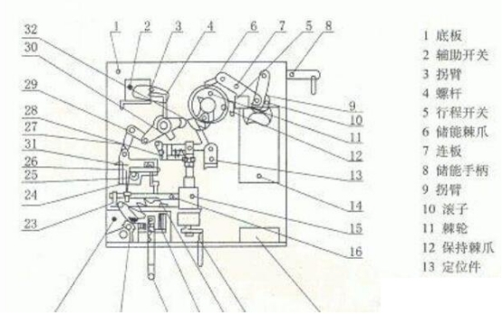 此組織為電動儲能,電動分合閘,一同具有手動功用。整個結構由合閘繃簧,儲能體系,過流脫扣器,分合閘線圈,手動分合閘體系,輔佐開關,儲能指示等部件組成。